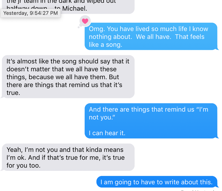 I want to share with you a text string between my middle son and me that continues to prompt my heart as I interact with people in my life. Some I know well, others hardly at all.